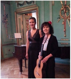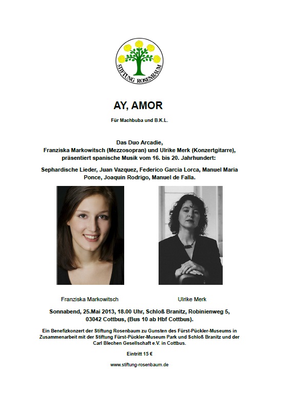 Der schönste Raum im Schloß Branitz bei Cottbus ist das Musikzimmer. Hermann Fürst Pückler, der große Dandy des 19.Jahrhunderts, besaß damit innerhalb seiner phantastischen Parklandschaft ein Kleinod – genau der richtige Ort für die Musik von Franziska Markowitsch Mezzosopran) und Ulrike Merk (Konzertgitarre), die das Publikum mit ihrem Gang durch die spanische Musik begeisterten.