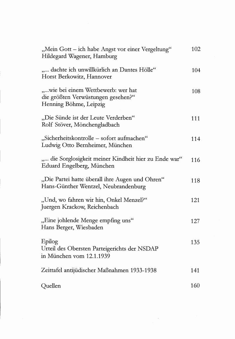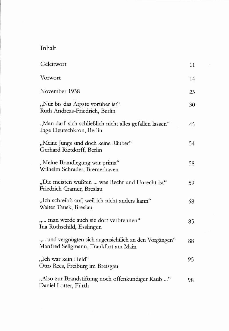 Die Anthologie enthält 19 Augenzeugenberichte zu den Novemberpogromen, von denen acht erstmals publiziert wurden. Neben einer historischen Einleitung enthält der Band eine Zeittafel antijüdischer Maßnahmen, die die wichtigsten Textpassagen aus Gesetzen, Verordnungen und Erlassen von 1933 bis 1938 zusammenstellt.